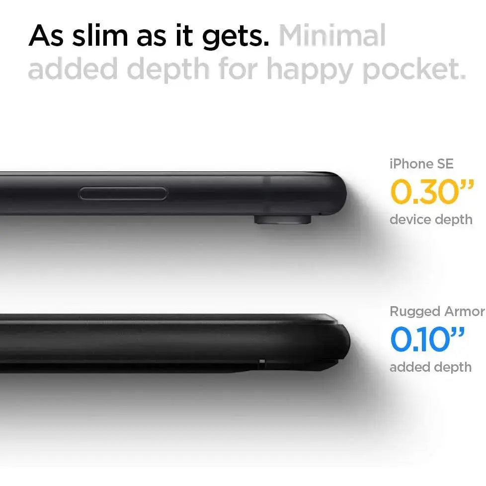 Spigen iPhone SE Case Rugged Armor - Inspired by car design, Rugged Armor® secures the iPhone in a timeless and streamlined body. Its slim frame is textured with carbon fiber detailing and subtle glossy accents.