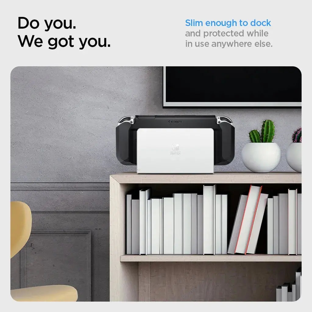 Spigen Nintendo Switch OLED Case Thin Fit - Covered and in control. Slim enough to dock and protected while in use anywhere else. Slim installation with working kickstand functionalities. Precisely designed to fit seamlessly and utilize all functionalities.