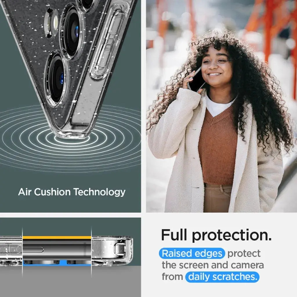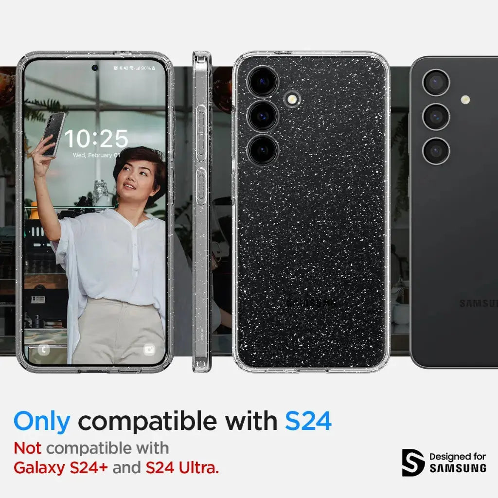 Shining. Shimmering. Protected. The Liquid Crystal Glitter Galaxy S24 case streamlines a whole new dimension to your Galaxy. Its form-fitting design keeps everyday dings and scratches away. Wherever you go, always behold the splendid style of your Galaxy.