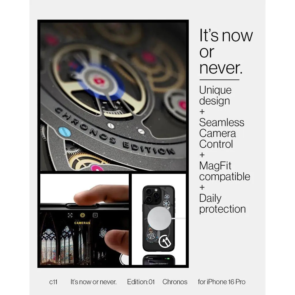 Time is of the essence. Gear up your iPhone 16 Pro with the c11 Chronos. Capture the construct of time with in-depth clockwork for a sleek look every second. It's packed with MagFit for powerful MagSafe connection and topped off with the T Series button cover for seamless Camera Control. Add this limited timepiece to your collection before time runs out.