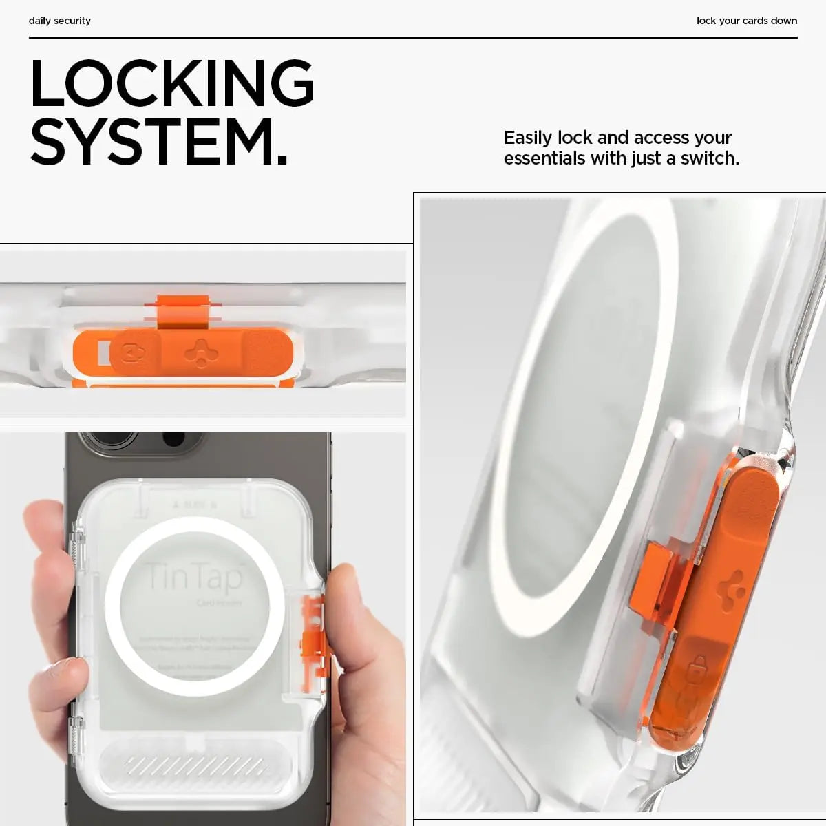 Secures credit, debit, and ID cards via unique locking mechanism