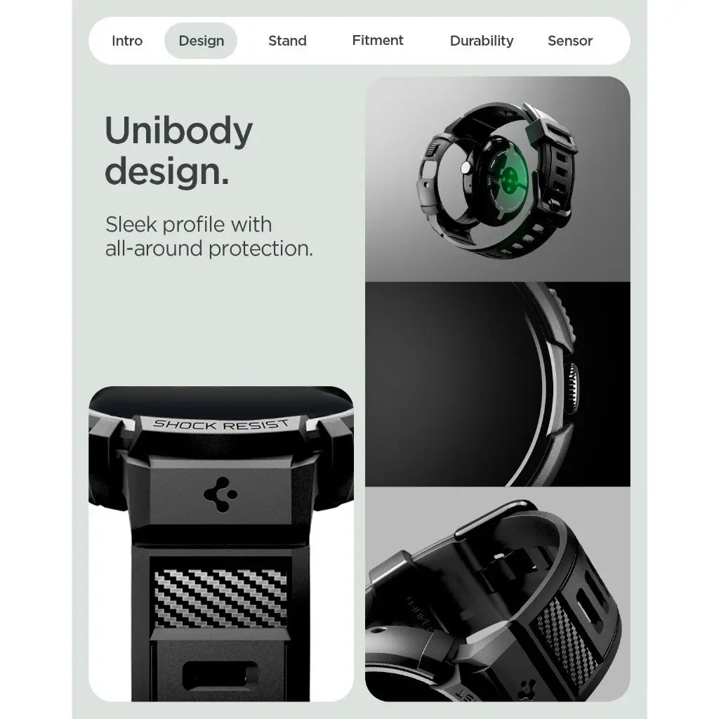 Rugged design: Unibody case with unique carbon fiber accents absorbs shock, keeping your watch safe from bumps and scratches